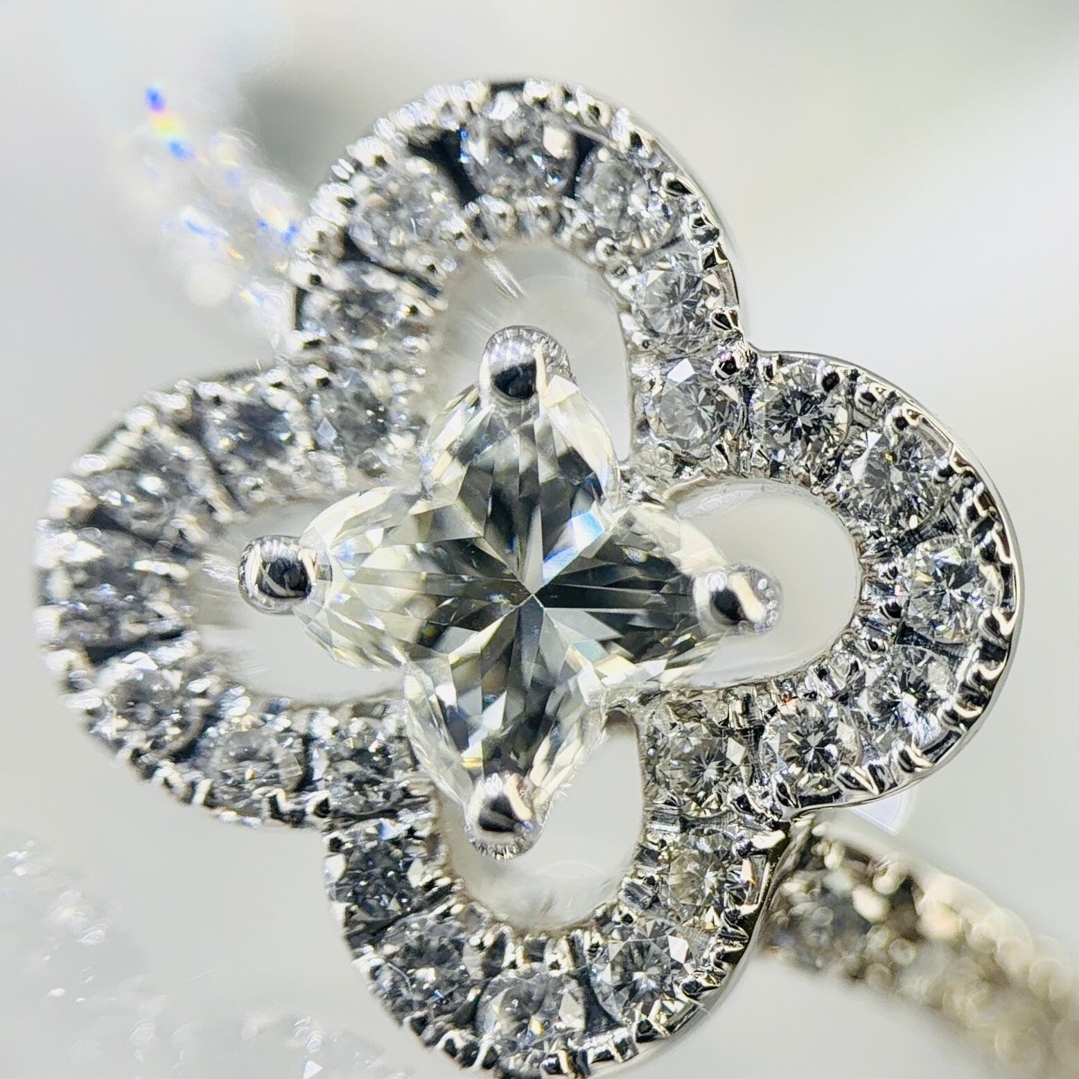 クローバーモチーフの取り巻きには、美しいメレダイヤをセッティング。