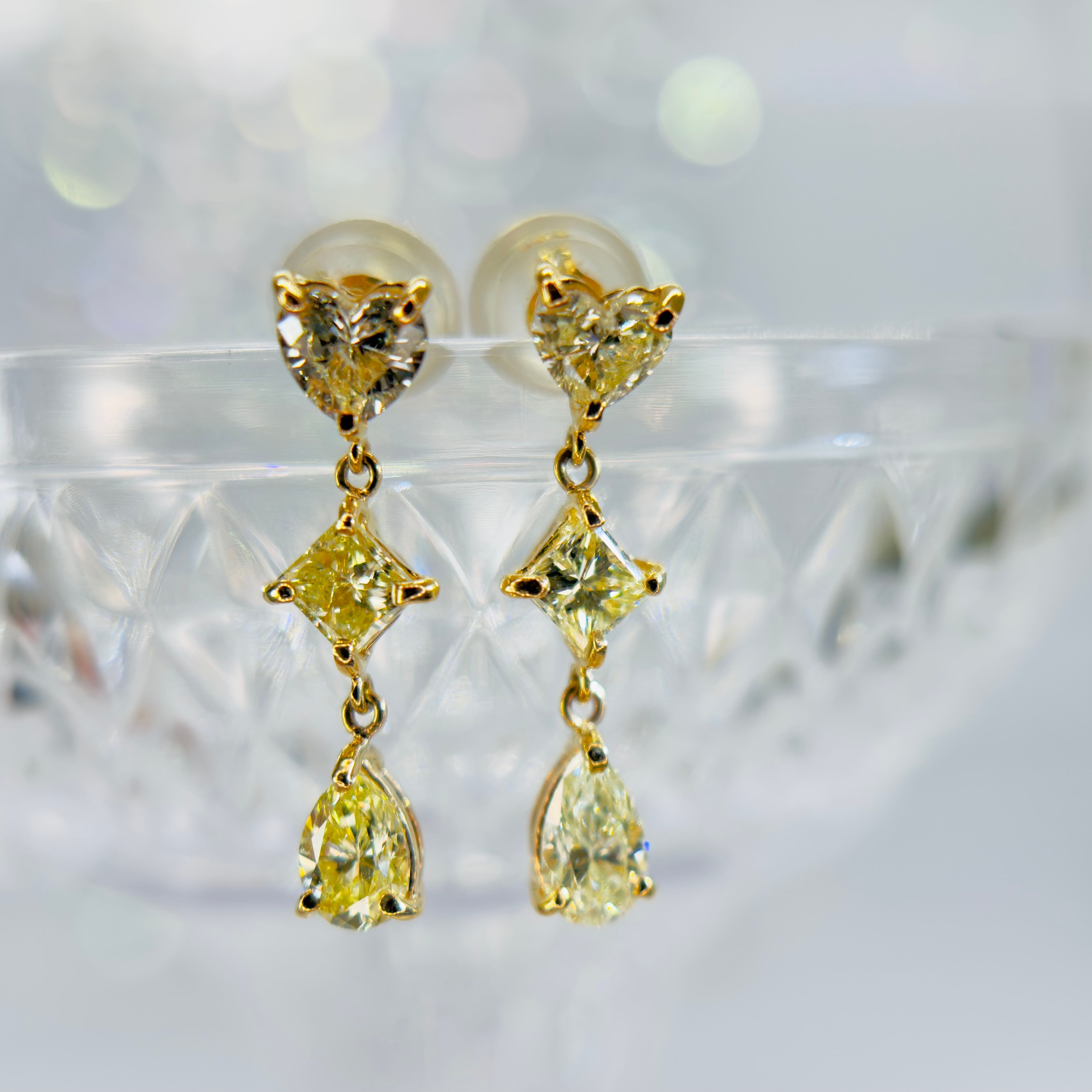 美しいファンシーシェイプダイヤのスリーストーンピアスです。