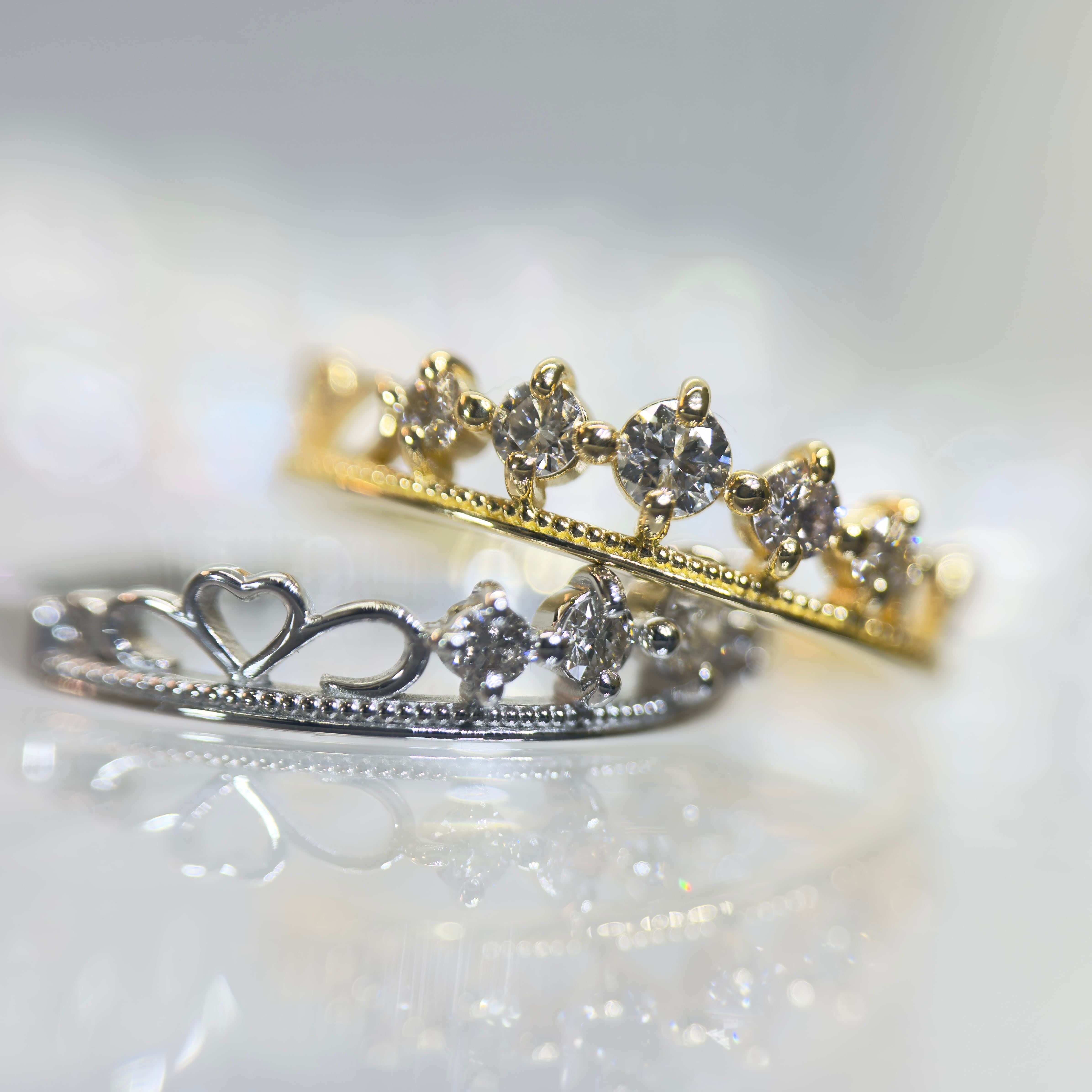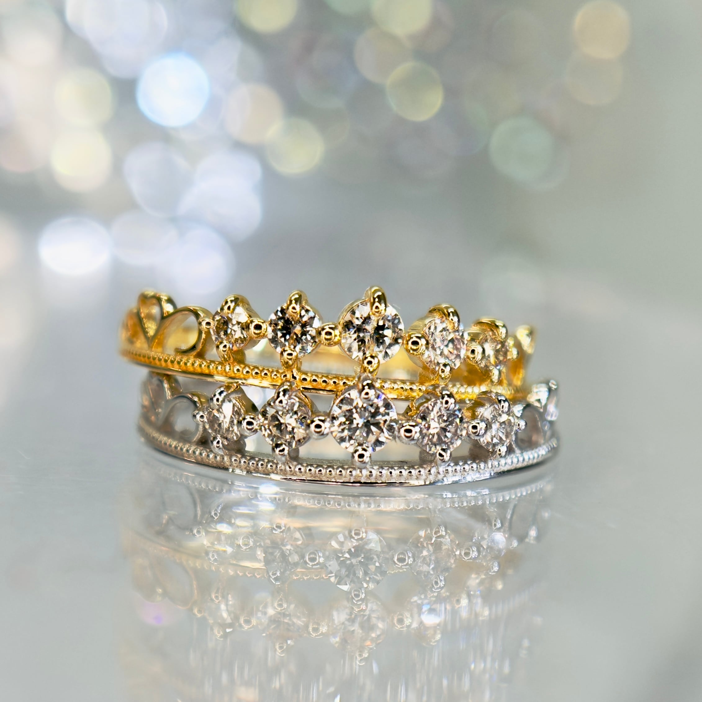 繊細なエタニティリングに、ミルグレインリングを重ね付けしたような、レイヤード型エタニティリング。