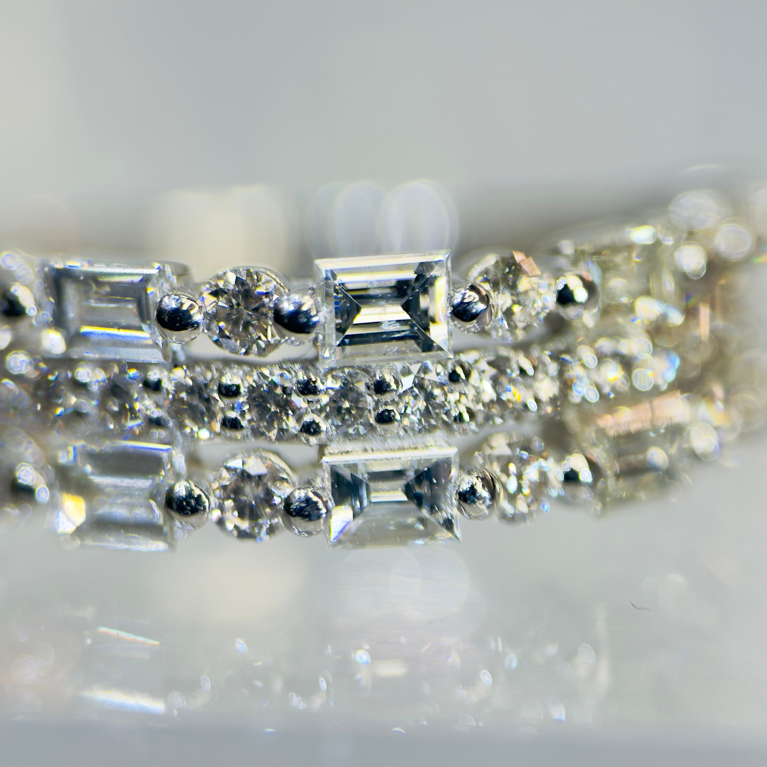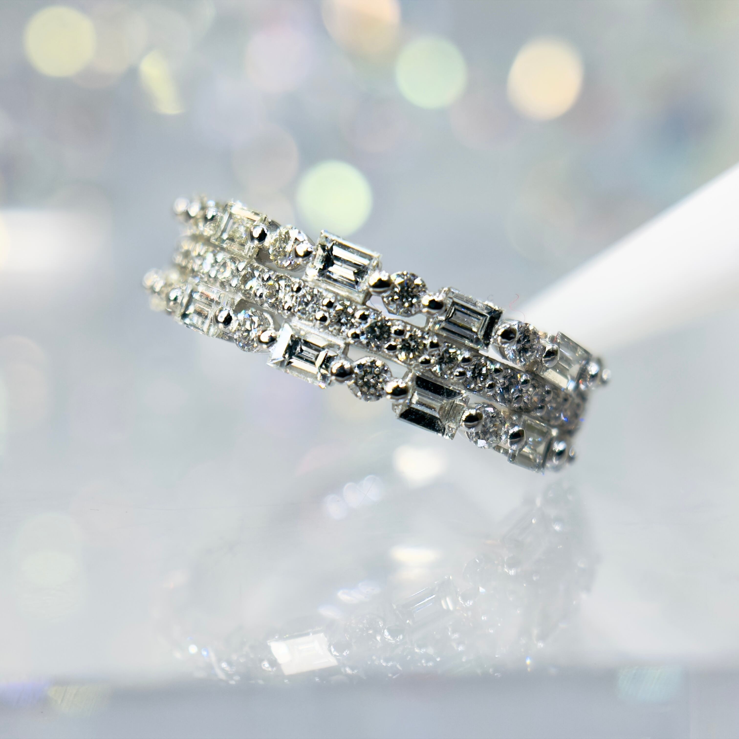 ラウンドカットとバゲットカットをリズミカルに配したデザインは、端正でありながらも豊かな表情を演出します。