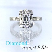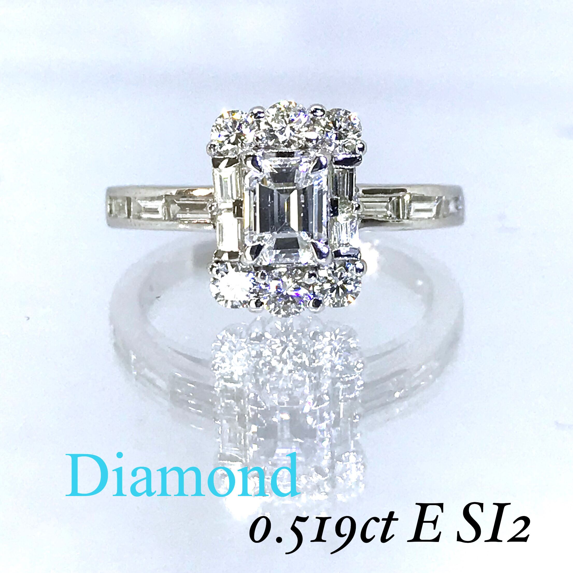 センターに輝くダイヤは、0.519ct Eカラー SI2の綺麗なエメラルドカットダイヤ。
