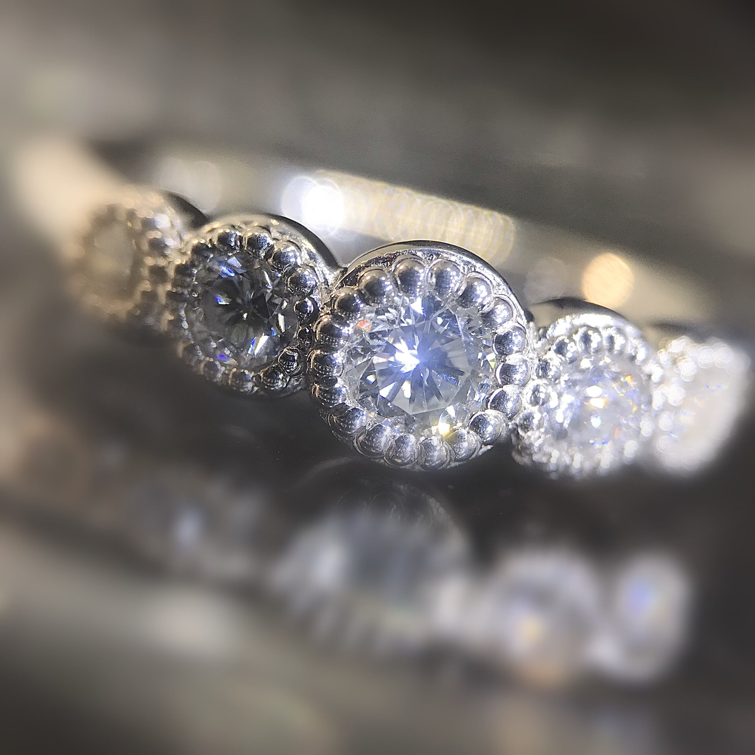 美しいダイヤの周りを、丁寧なミル打ち(ミルグレン)加工で仕立てました。