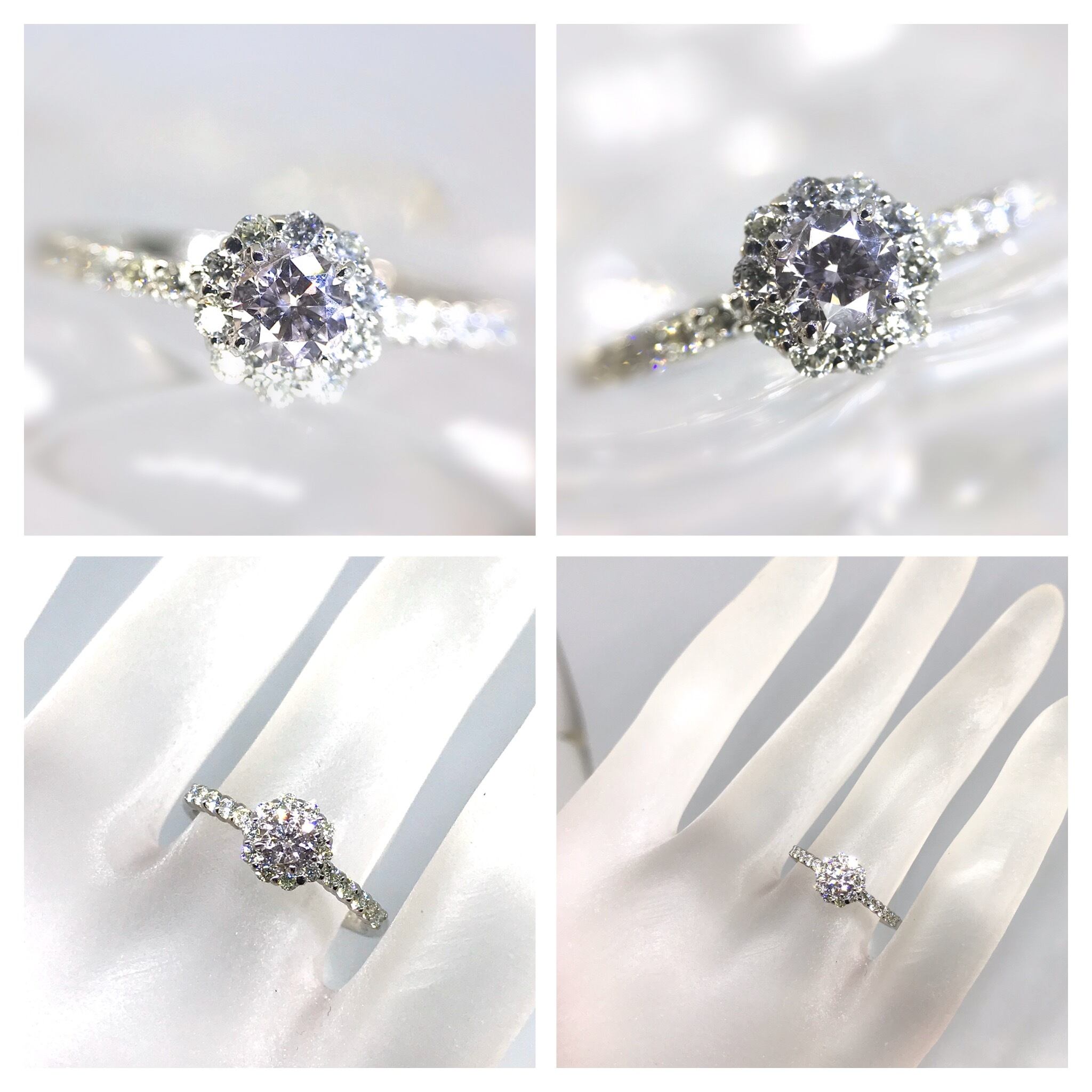 脇石には無色透明の綺麗なメレダイヤをセッティングし、人気のソリティアスタイルへ仕立てました。