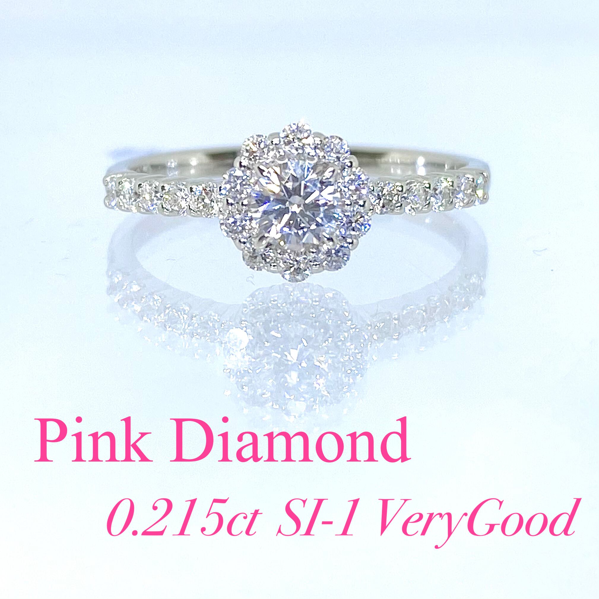 センターに輝くダイヤは、0.215カラットの大粒ピンクダイヤモンド。