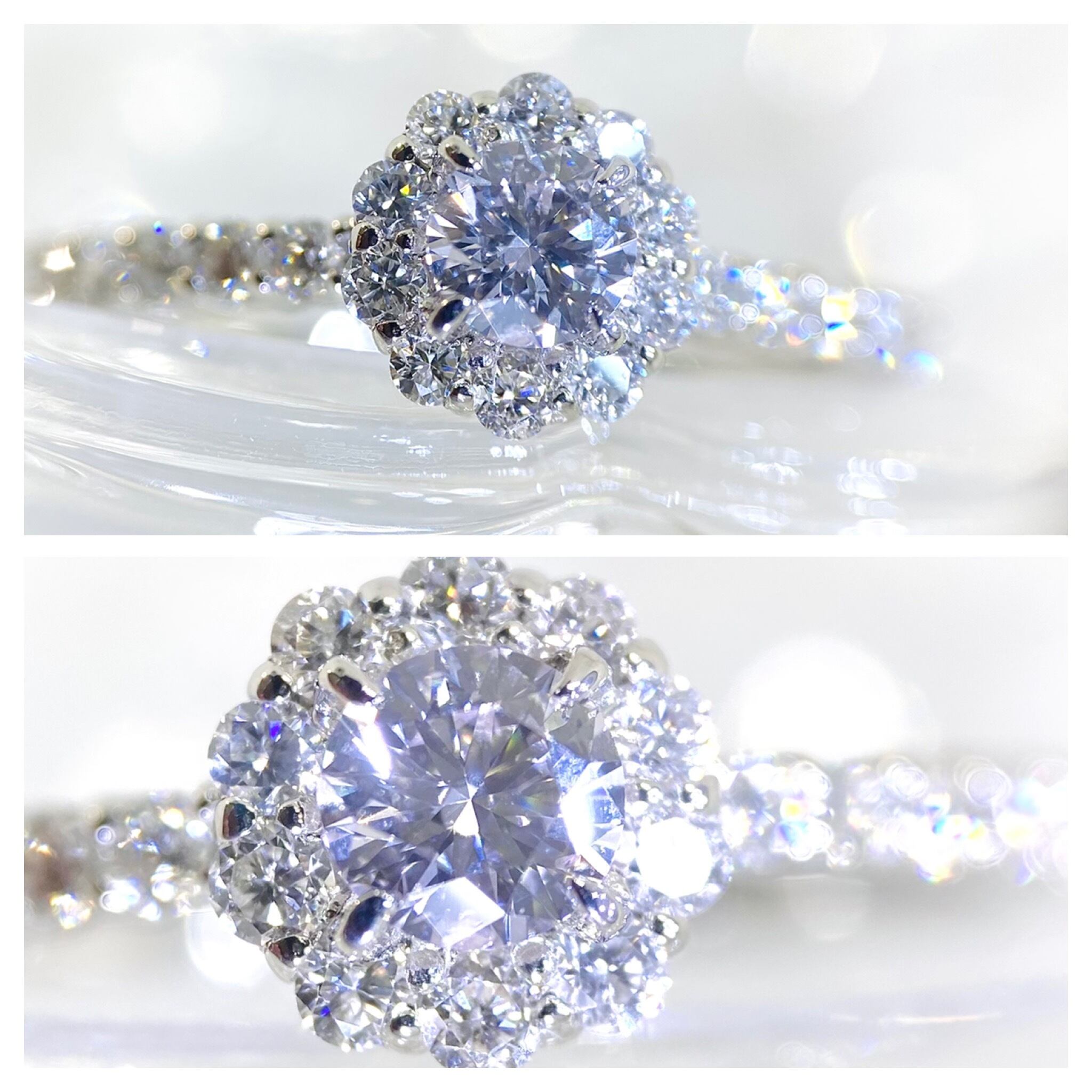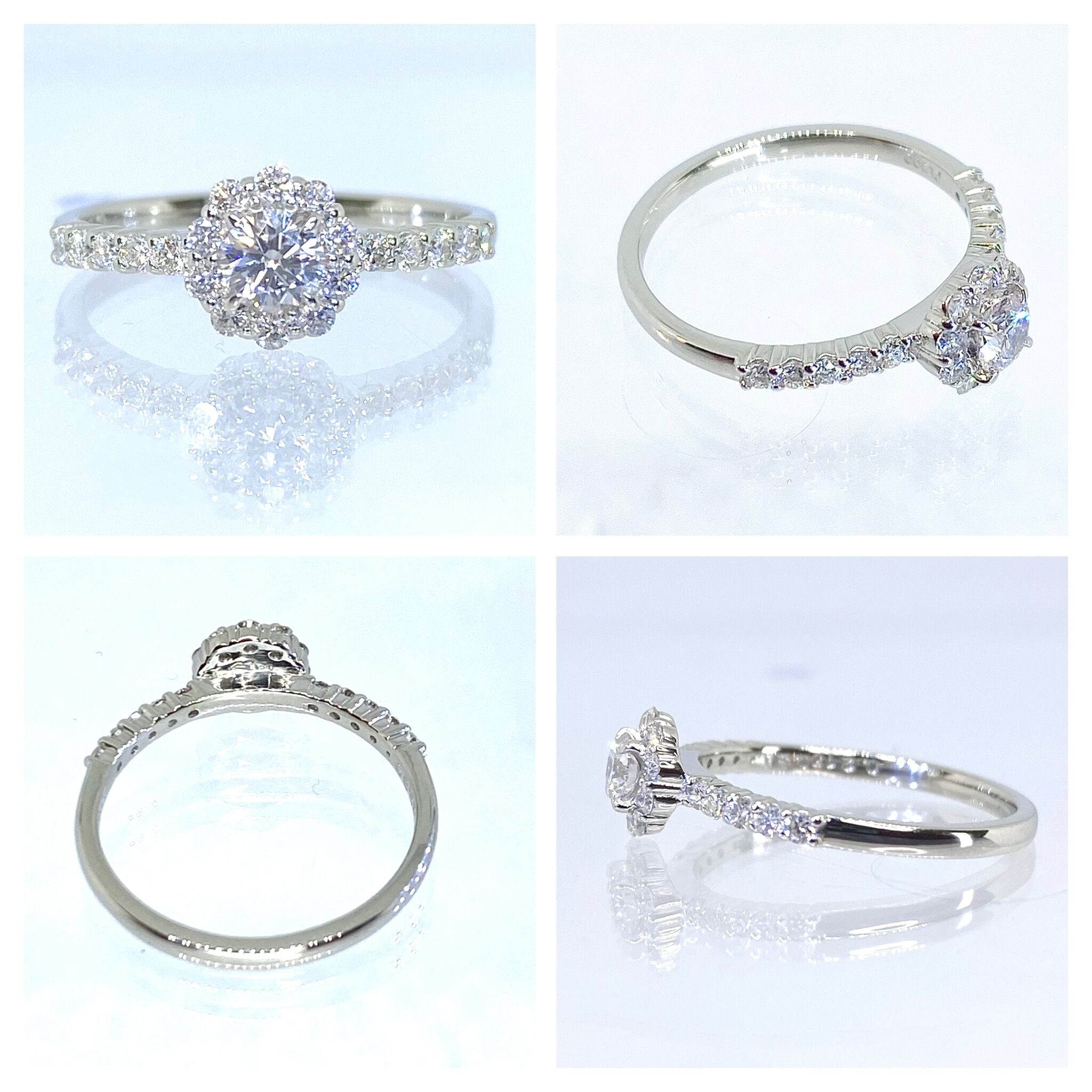 脇石には無色透明の綺麗なメレダイヤをセッティングし、人気の取り巻きスタイルへ仕立てました。